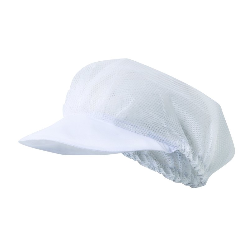 Cofia con rejilla y goma elástica en el interior de la parte posterior. Sarga: 65% poliéster – 35% algodón. Rejilla: 100% poliéster. Gramaje sarga 190 gr/m2. Rejilla 62 gr/m2.